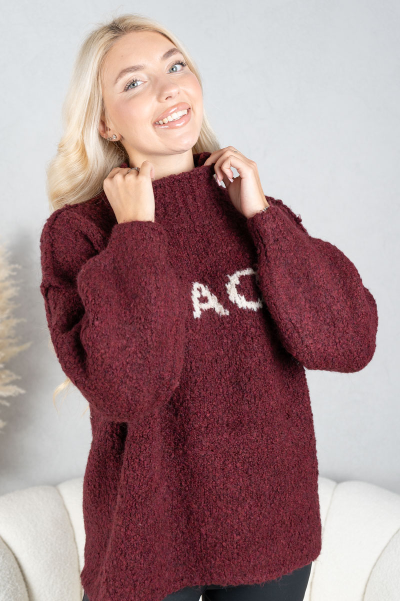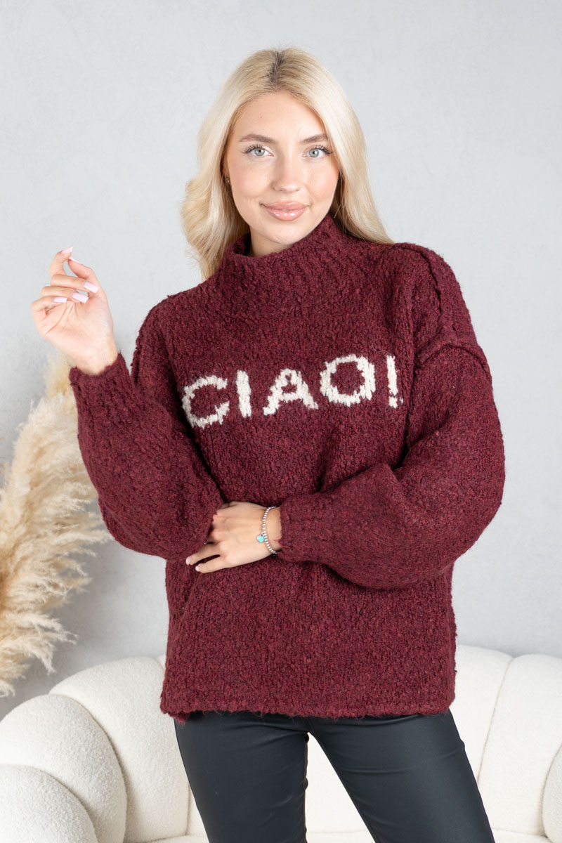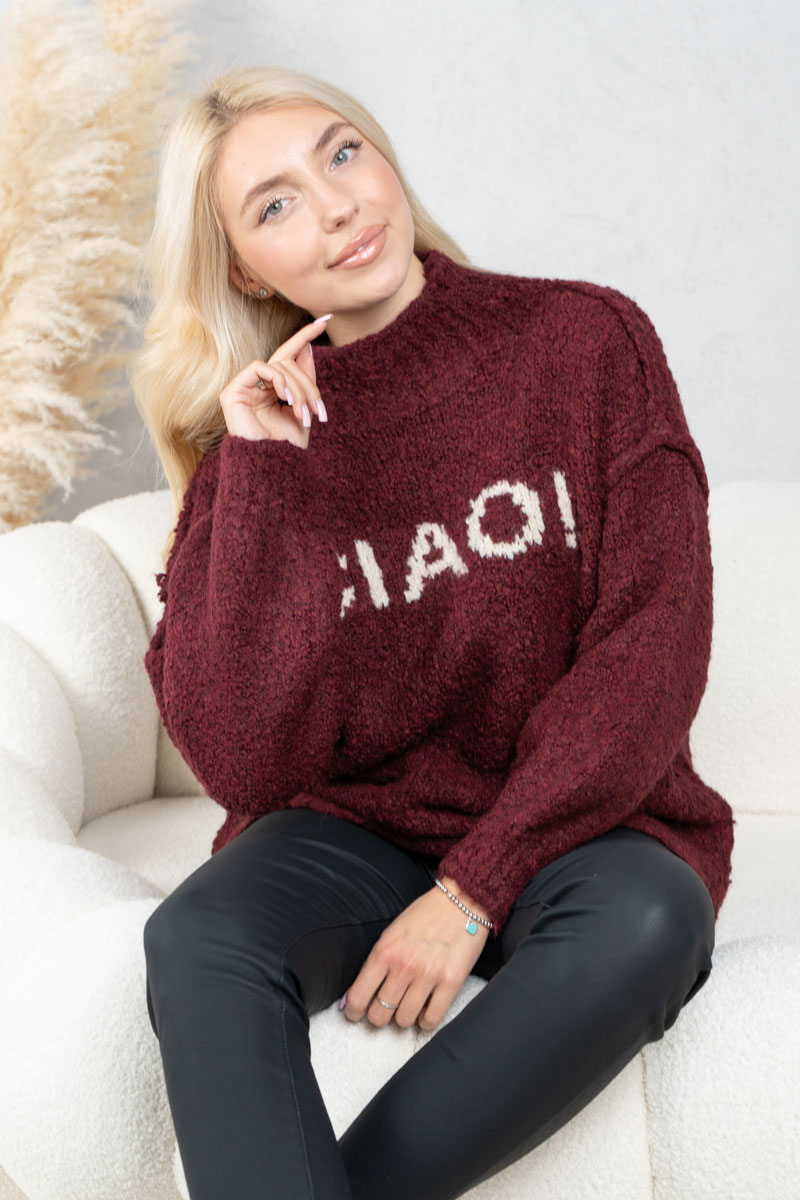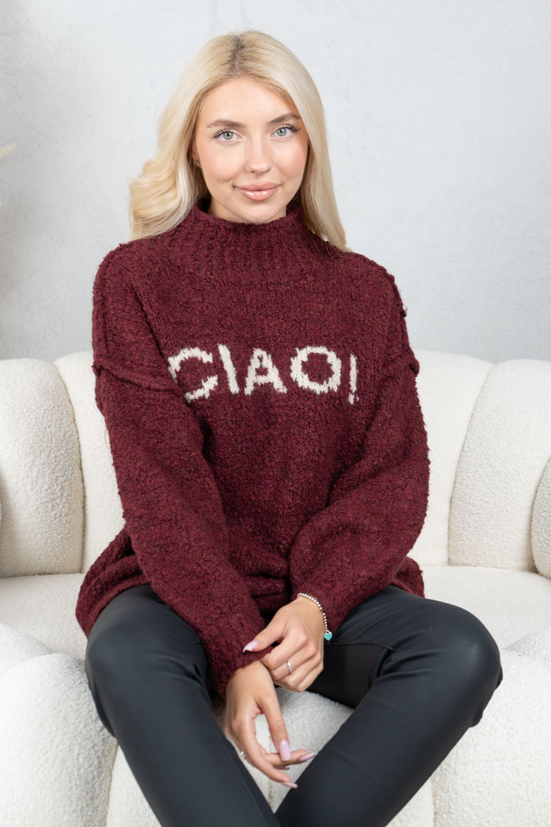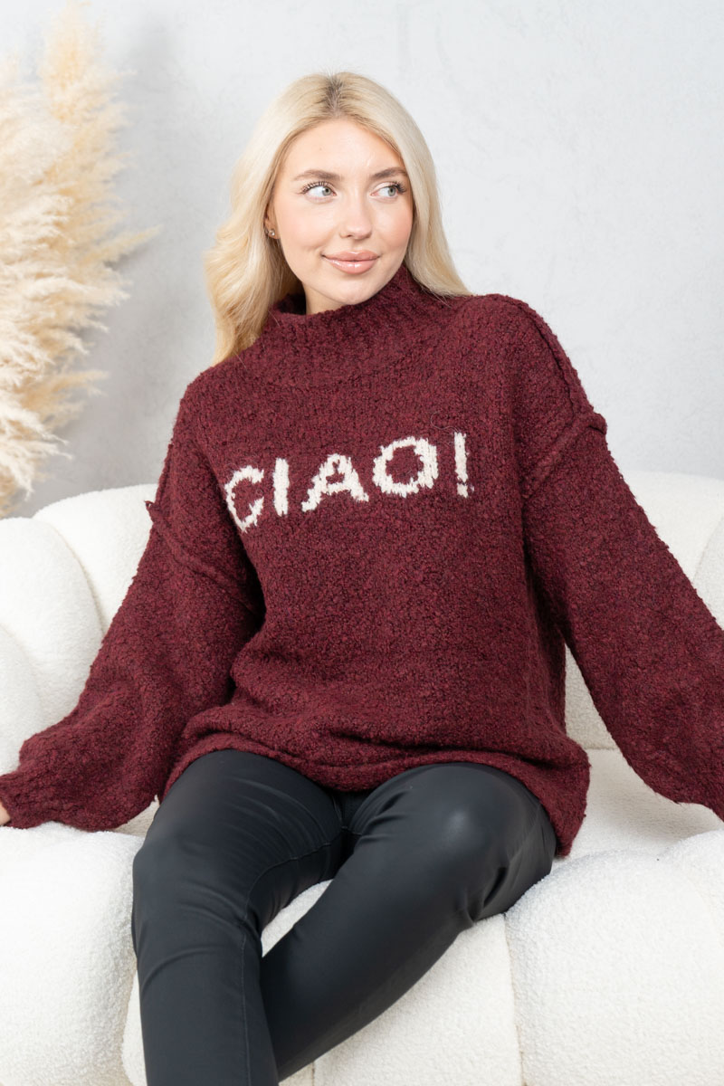 Sweter boucle CIAO! Cialisse w kolorze bordowym to stylowa i przytulna propozycja na jesienno-zimowy sezon. Wykonany z miękkiej, puszystej przędzy boucle, zapewnia przyjemne ciepło i komfort noszenia. Luźny fason z obniżonymi ramionami gwarantuje swobodę ruchów, a wyrazisty napis „CIAO!” na przodzie dodaje swetrowi energicznego, młodzieżowego charakteru. Głęboki bordowy odcień wprowadza nutę elegancji i doskonale komponuje się z jeansami lub spódnicą. To idealny model dla kobiet, które cenią wygodę połączoną z modnym, wyrazistym stylem.