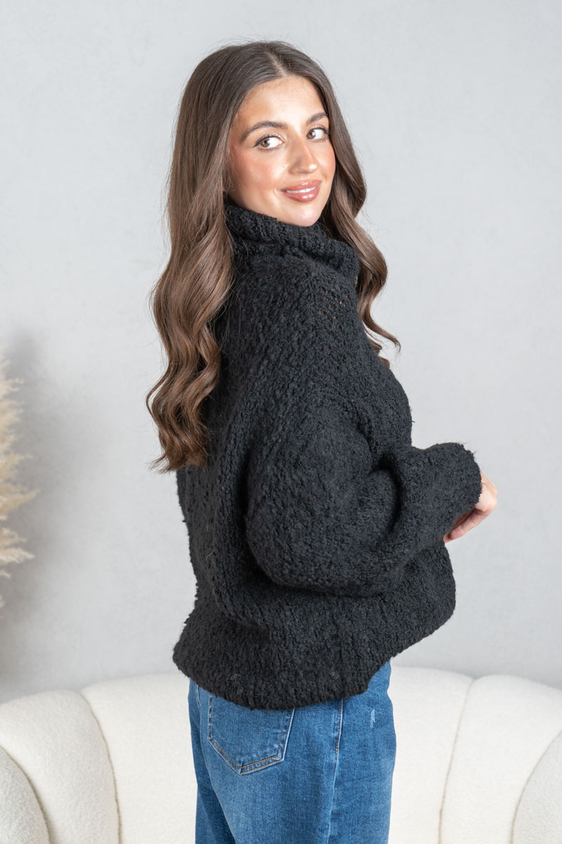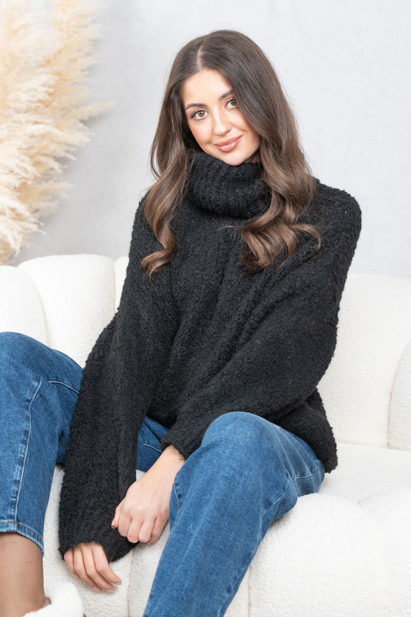 Sweter boucle z golfem Molivane w kolorze czarnym to stylowa propozycja dla miłośniczek ciepła i wygody. Wykonany z miękkiej, puszystej przędzy boucle, zapewnia przyjemne otulenie i komfort noszenia w chłodne dni. Luźny fason z szerokim golfem nadaje całości przytulnego charakteru, a elastyczne ściągacze przy rękawach i u dołu utrzymują idealny kształt. Klasyczna czerń sprawia, że sweter doskonale komponuje się z wieloma stylizacjami – od casualowych po bardziej eleganckie. To uniwersalny model, który łączy modny wygląd z funkcjonalnością i wygodą.