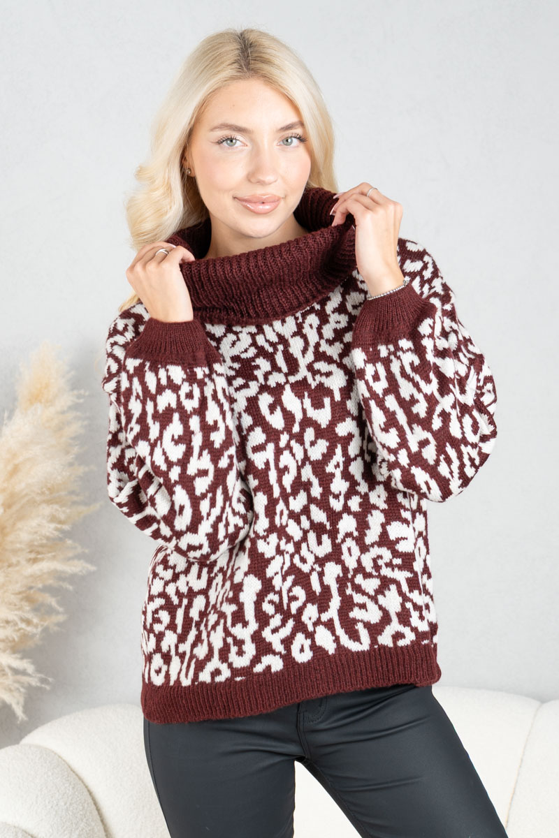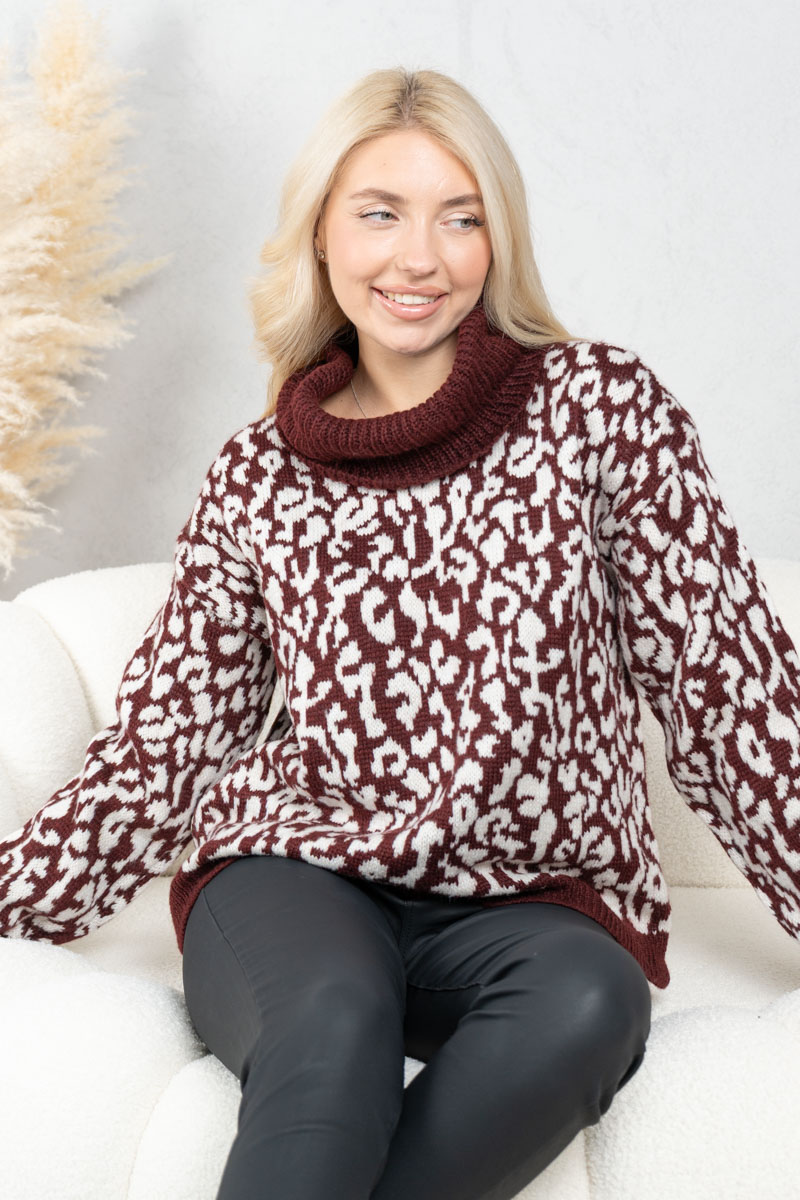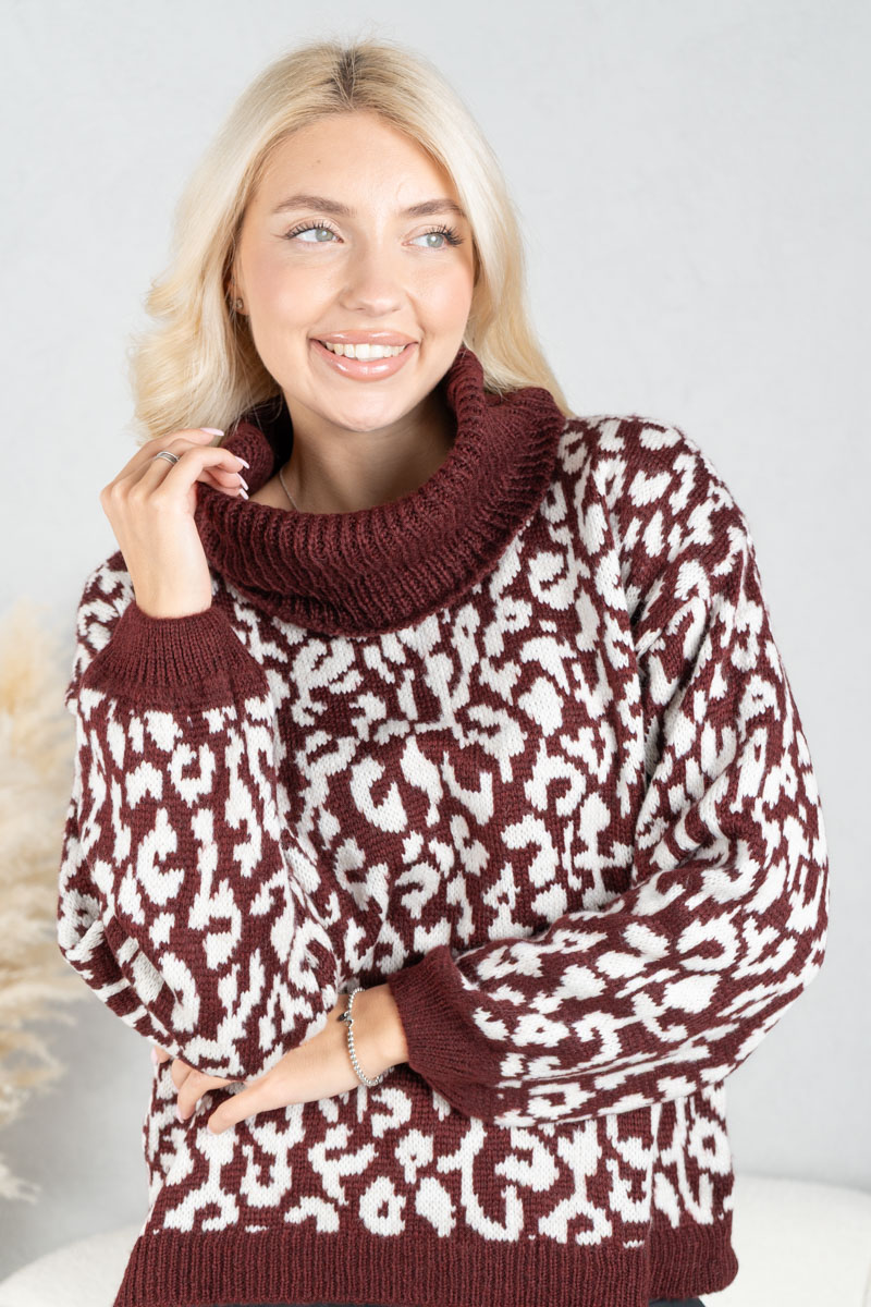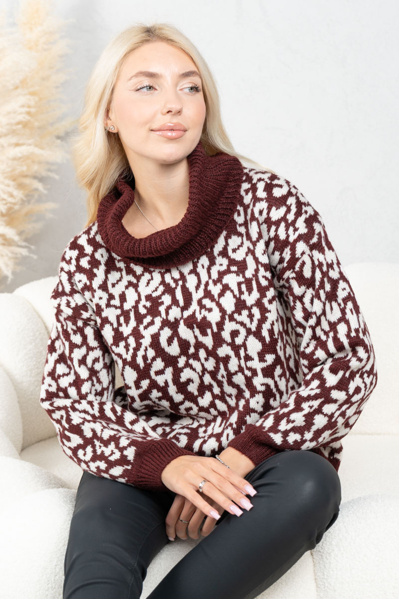 Sweter w panterkę z golfem Bordowy – Panthirra