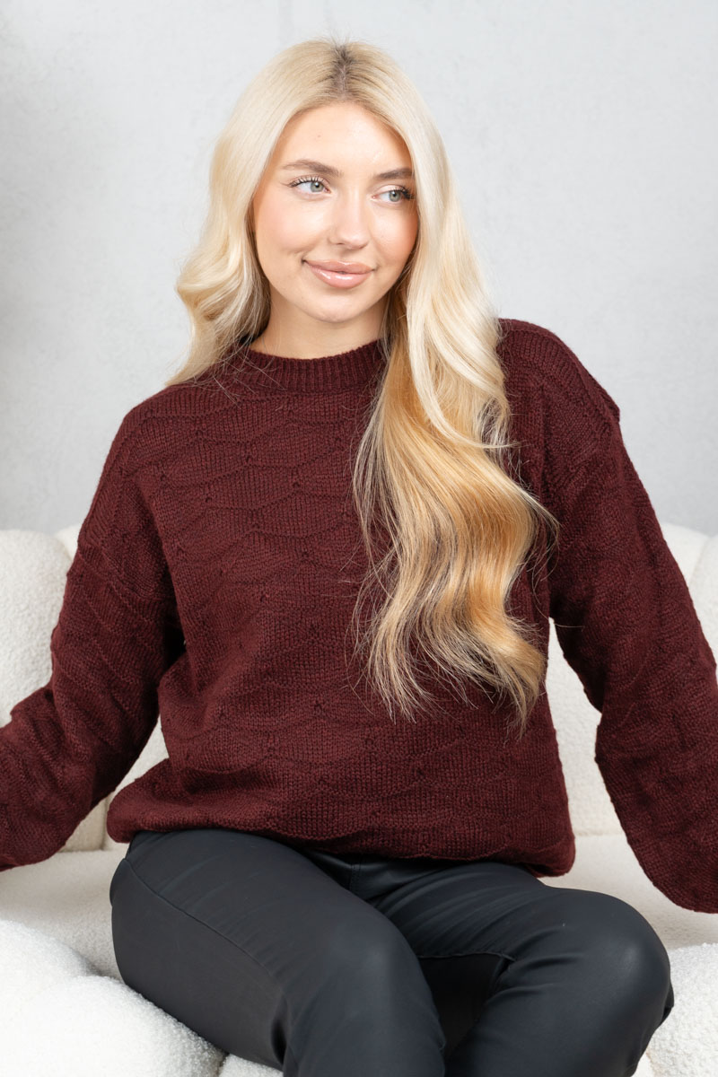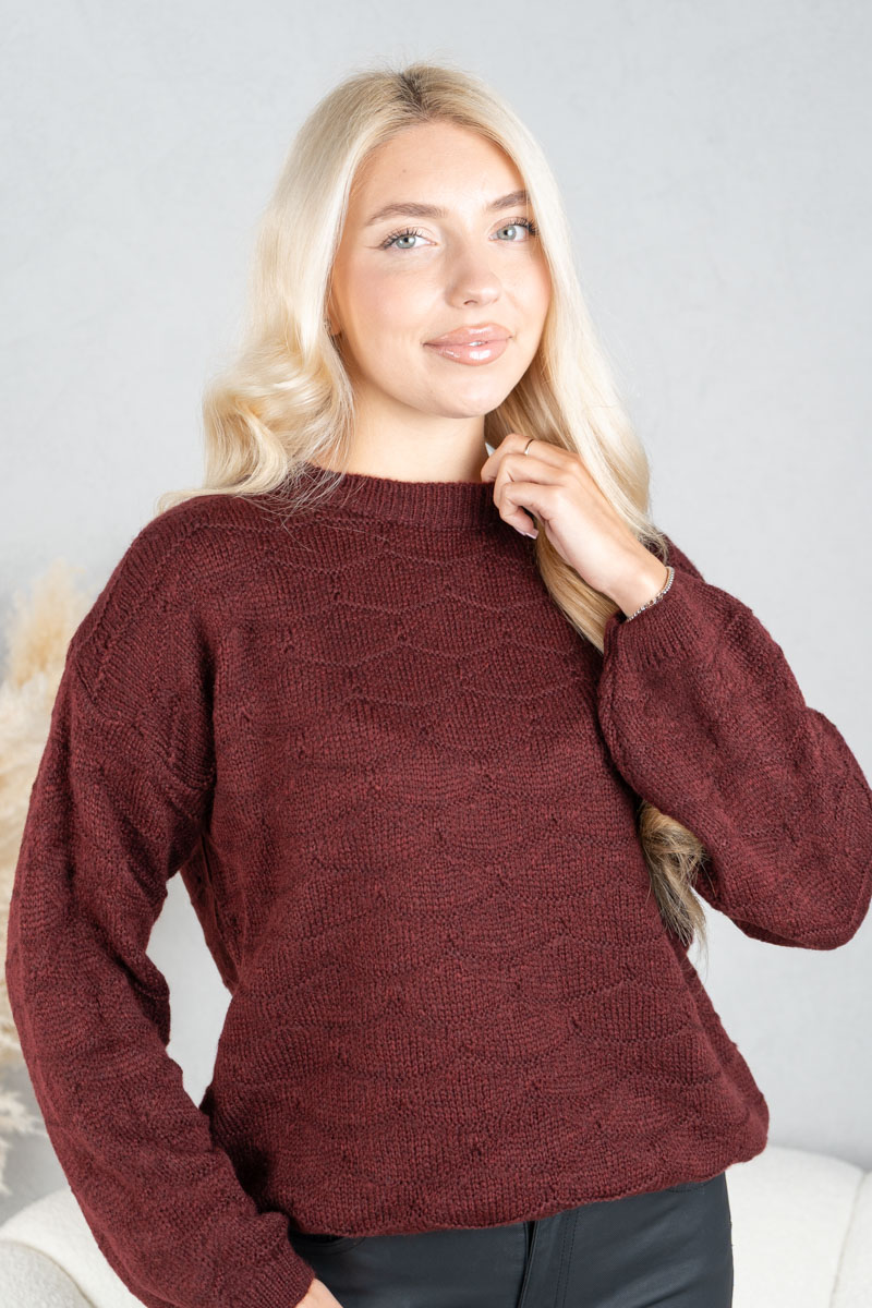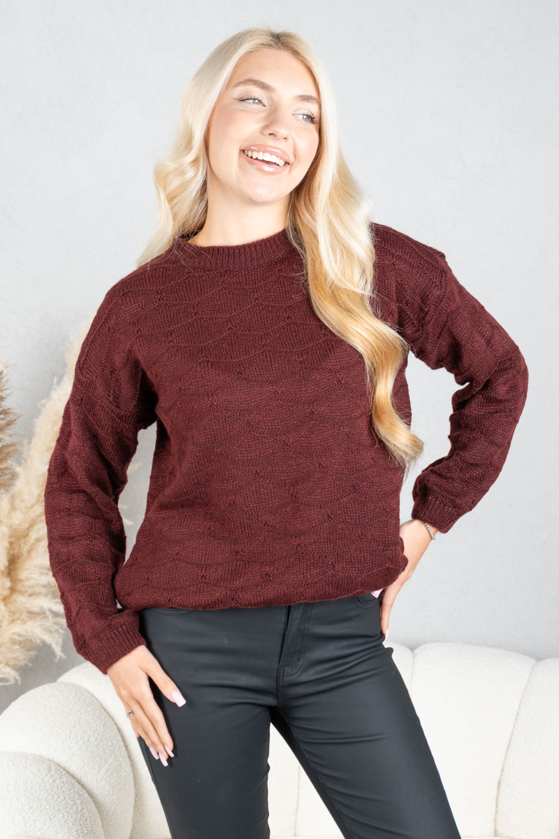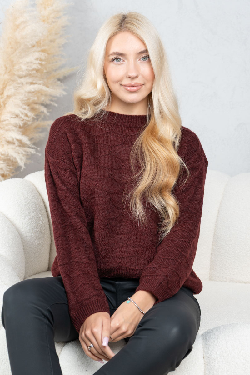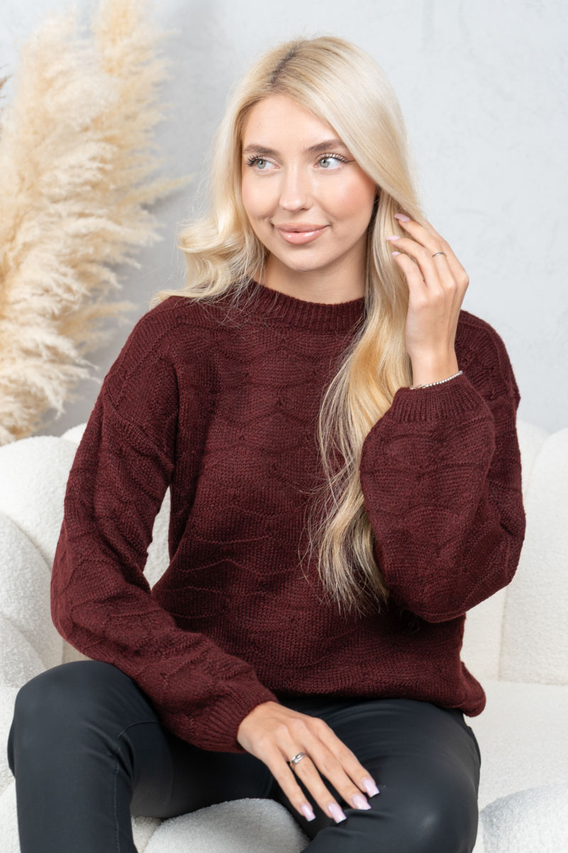 Gładki sweter damski Silvora w kolorze bordowym to klasyczna i wygodna propozycja na chłodniejsze dni. Wykonany z miękkiej, elastycznej dzianiny, zapewnia ciepło i komfort noszenia przez cały dzień. Delikatny wzór w drobny splot nadaje mu subtelnego charakteru, a prosty krój sprawia, że świetnie dopasowuje się do sylwetki. Wykończony ściągaczami przy rękawach i u dołu, zachowuje swój kształt i wygląda schludnie. Głęboki bordowy odcień dodaje elegancji i doskonale komponuje się z jeansami, spódnicą lub spodniami materiałowymi, tworząc uniwersalny, kobiecy look.