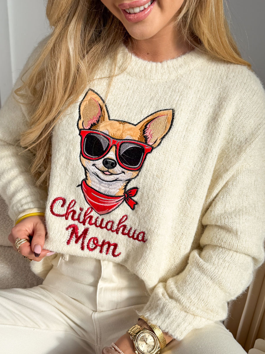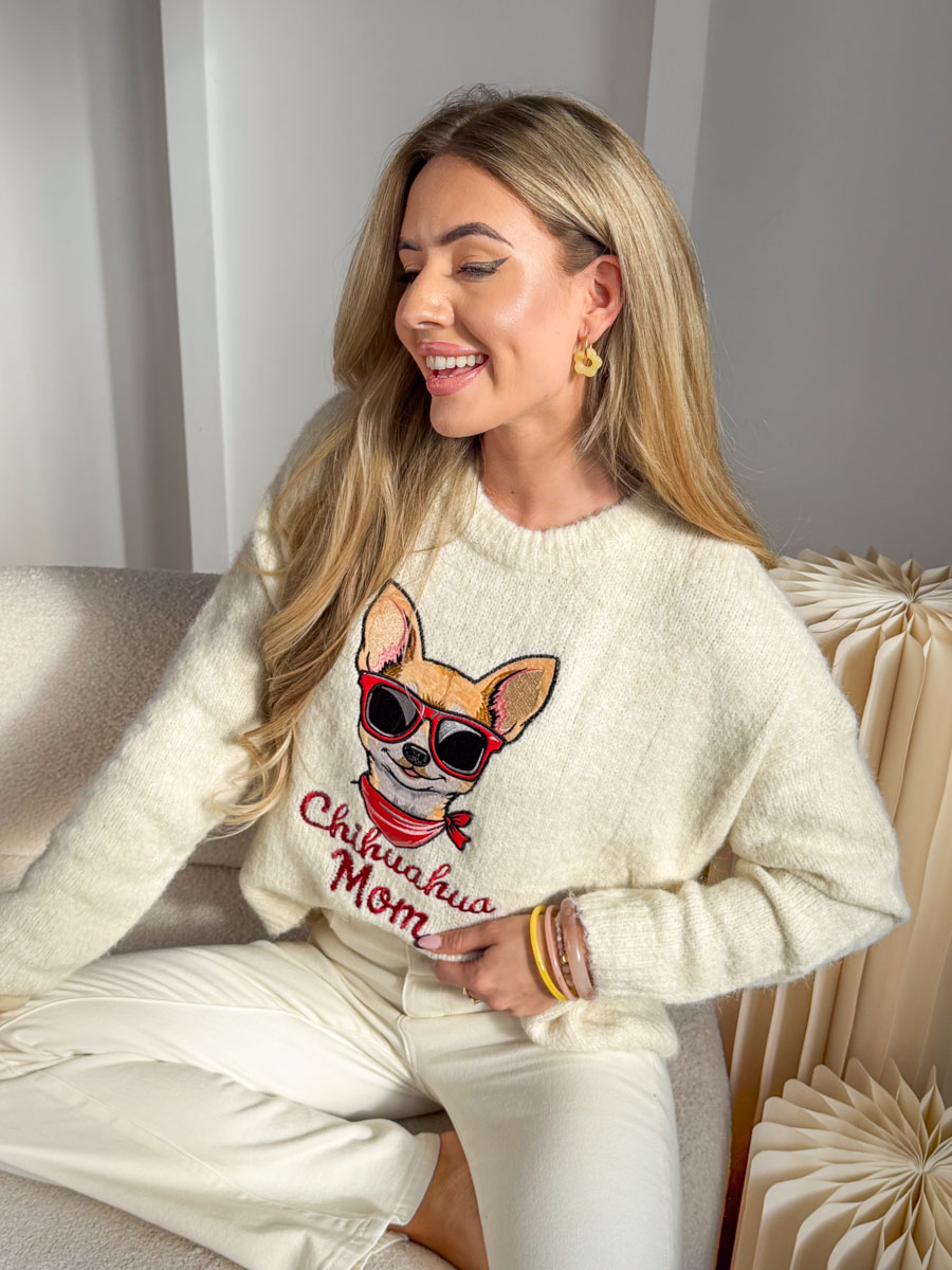 Sweter „Chihuahua Mom” w modnym, beżowym odcieniu to idealna propozycja dla miłośniczek czworonogów i stylowych, casualowych stylizacji. Wykonany z miękkiej, przyjemnej w dotyku dzianiny, zapewnia komfort noszenia przez cały dzień. Na przodzie znajduje się efektowny nadruk z wizerunkiem chihuahua w okularach oraz napisem, który podkreśla charakter i poczucie humoru właścicielki. Klasyczny krój z długim rękawem sprawia, że sweter świetnie komponuje się z jeansami czy jasnymi spodniami. To wygodny i modny wybór na co dzień.