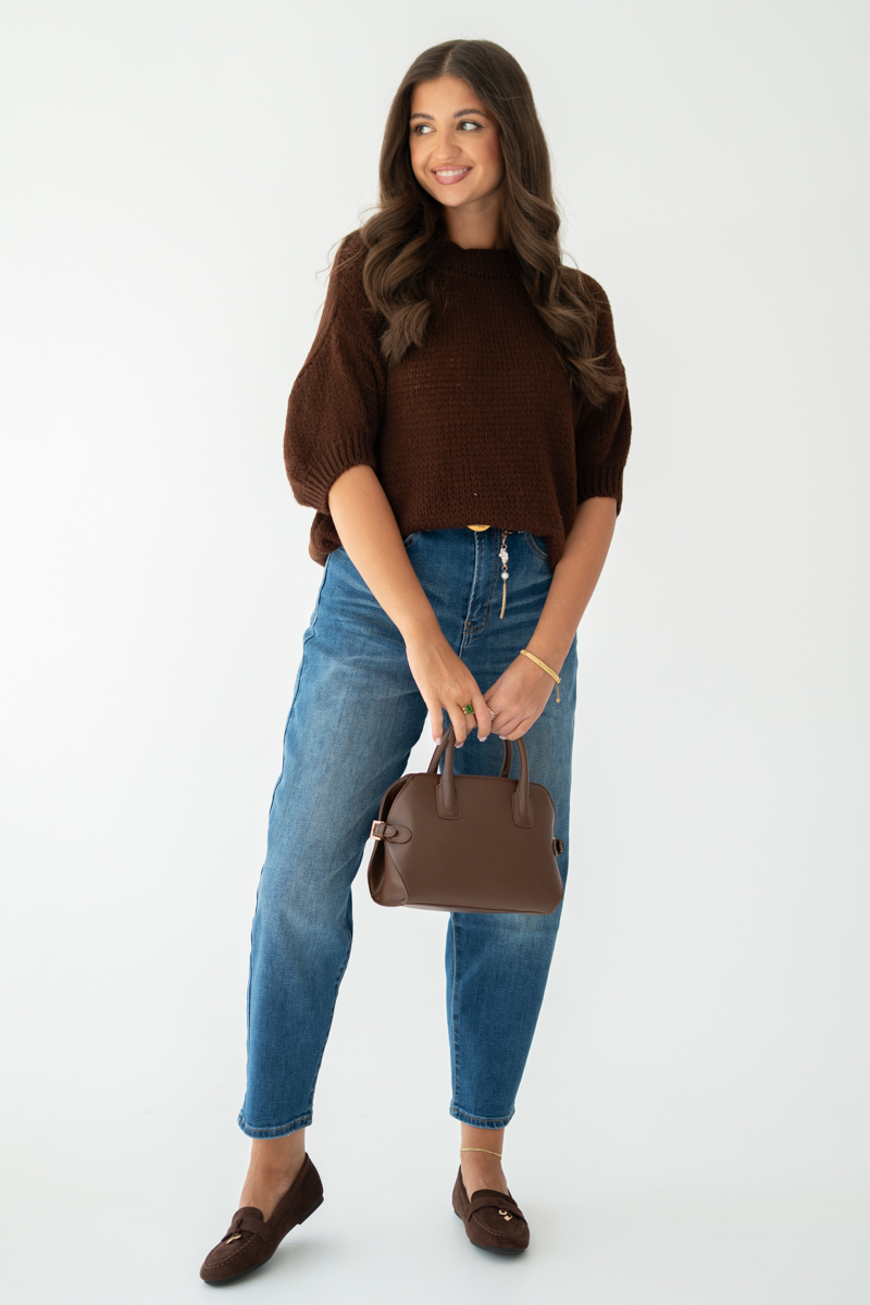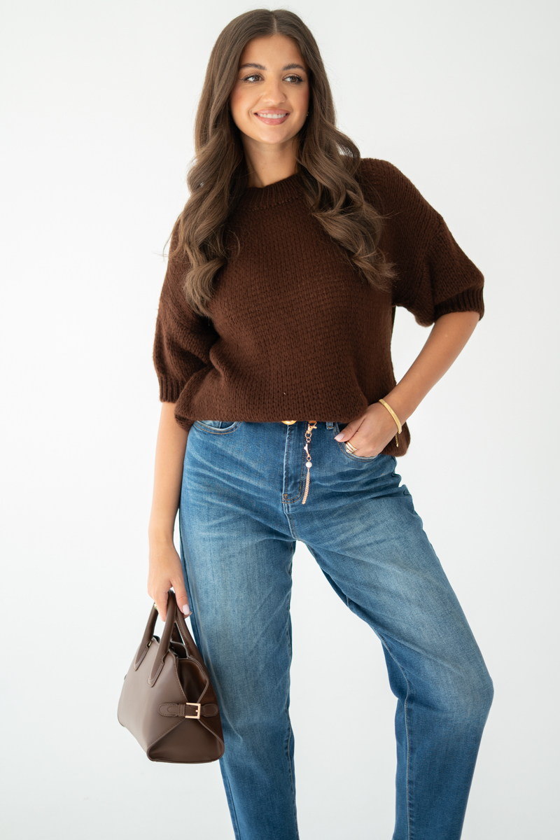 Sweter gładki basic z okrągłym dekoltem Czekoladowy – Lorivienne to minimalistyczna propozycja idealna na co dzień. Wykonany z miękkiego materiału gwarantuje komfort i przyjemność noszenia. Prosty krój z klasycznym okrągłym dekoltem i krótkimi, lekko bufiastymi rękawami dodaje całości subtelnej elegancji. Czekoladowy odcień pięknie komponuje się zarówno z jeansami, jak i bardziej eleganckimi elementami garderoby, tworząc uniwersalną bazę do wielu stylizacji. To ponadczasowy model, który sprawdzi się w każdej szafie.