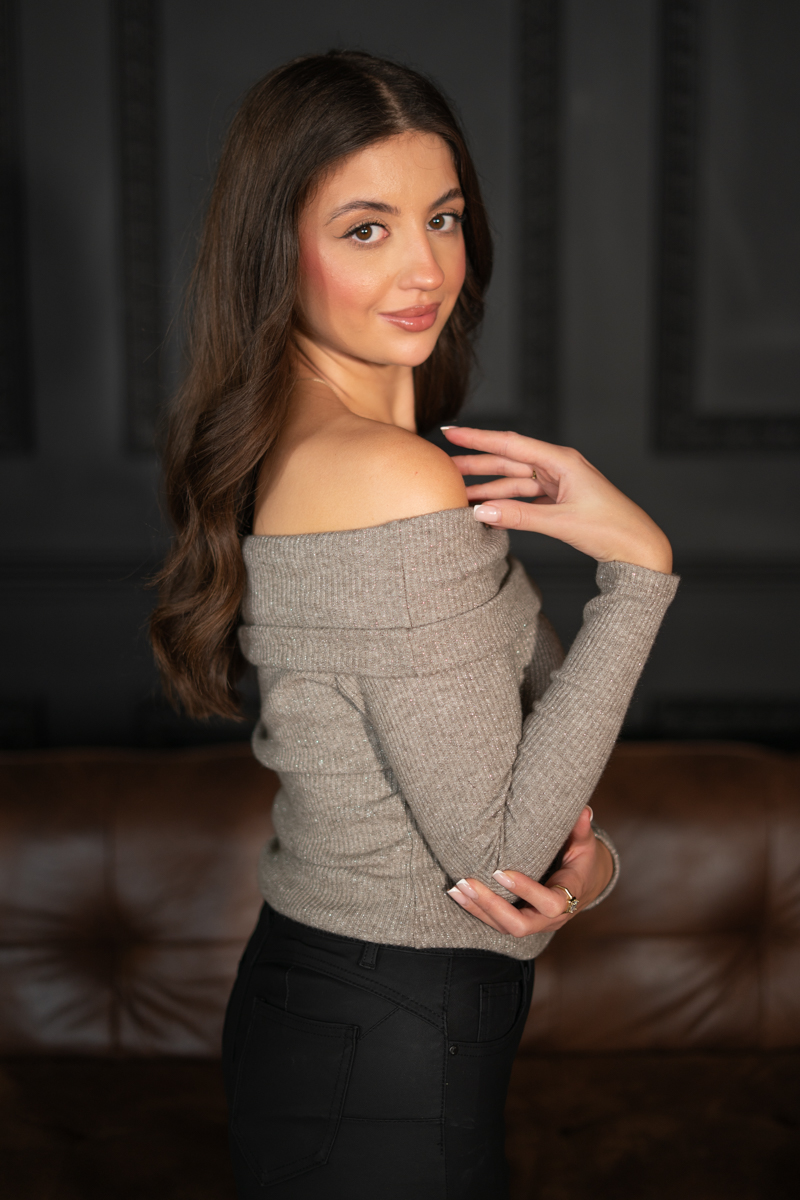 Sweter hiszpanka Solivra w kolorze fango to idealne połączenie wygody i kobiecego stylu. Wykonany z miękkiej, prążkowanej dzianiny, zapewnia komfort noszenia i świetnie dopasowuje się do sylwetki. Charakterystyczny, szeroki dekolt typu hiszpanka można nosić opuszczony na ramiona, co dodaje całości subtelnej elegancji i zmysłowego uroku. Długie rękawy oraz elastyczna struktura materiału sprawiają, że sweter jest praktyczny, a jednocześnie wyjątkowo stylowy. Doskonale sprawdzi się w codziennych stylizacjach – z jeansami, spódnicą czy eleganckimi spodniami – tworząc modny, nowoczesny look na chłodniejsze dni.