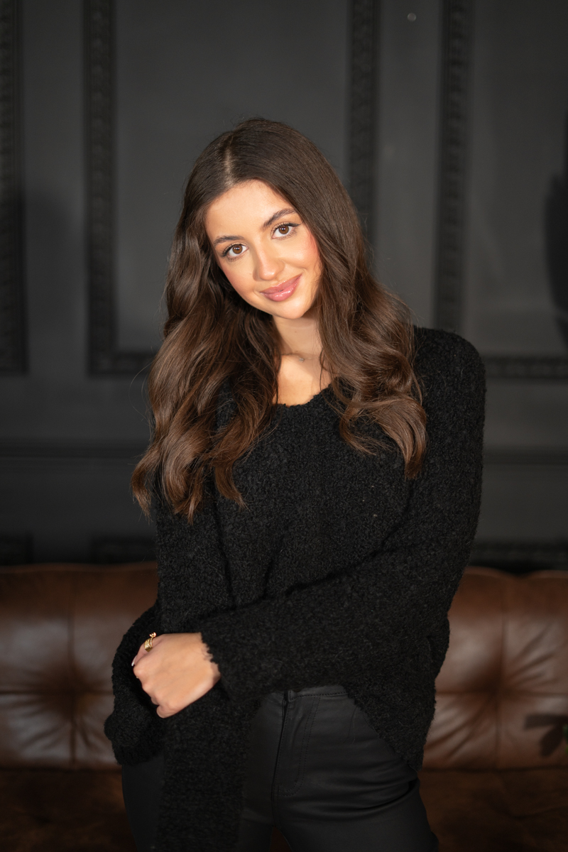Sweter bukla Czarny – Clavira to elegancki i ponadczasowy model wykonany z miękkiej tkaniny o charakterystycznej, teksturowanej strukturze bukla. Klasyczny dekolt w serek nadaje mu kobiecego charakteru i sprawia, że świetnie pasuje do wielu stylizacji. Głęboka czerń dodaje mu szyku, dzięki czemu sprawdzi się zarówno w codziennych, jak i bardziej eleganckich zestawach. Idealny do jeansów, spódnic oraz spodni materiałowych.