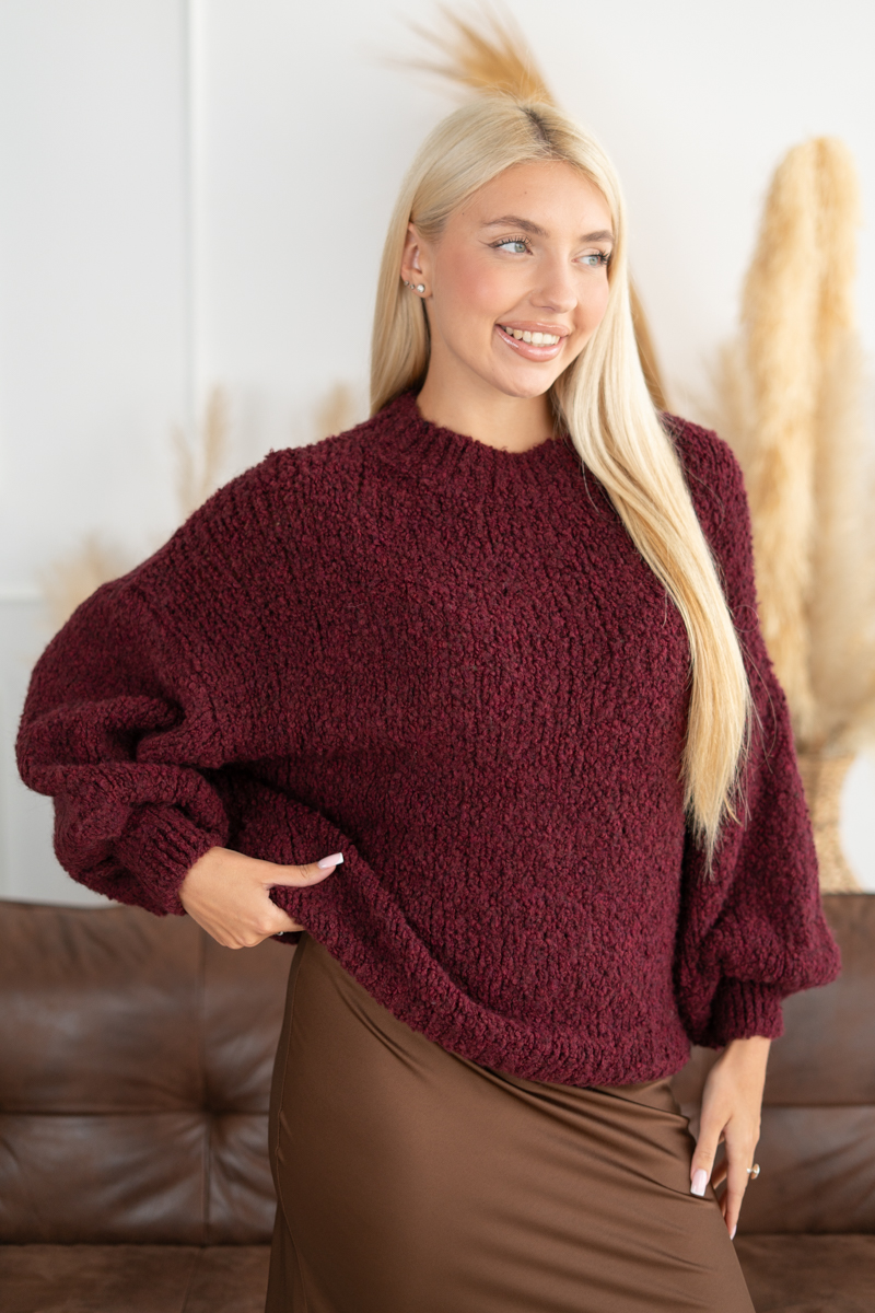 Sweter moherowy oversize Moirenne w bordowym odcieniu to ciepła i stylowa propozycja idealna na jesień i zimę. Wykonany z miękkiej, puszystej dzianiny, zapewnia komfort noszenia i przyjemnie otula w chłodniejsze dni. Luźny, oversize’owy krój gwarantuje swobodę ruchów oraz nowoczesny, lekko nonszalancki wygląd. Klasyczny okrągły dekolt sprawia, że sweter jest uniwersalny i łatwy do zestawienia zarówno z jeansami, jak i ze spódnicą czy eleganckimi spodniami. Głęboki bordowy kolor dodaje całości elegancji i wyrazistości, czyniąc go doskonałą bazą do modnych, sezonowych stylizacji.