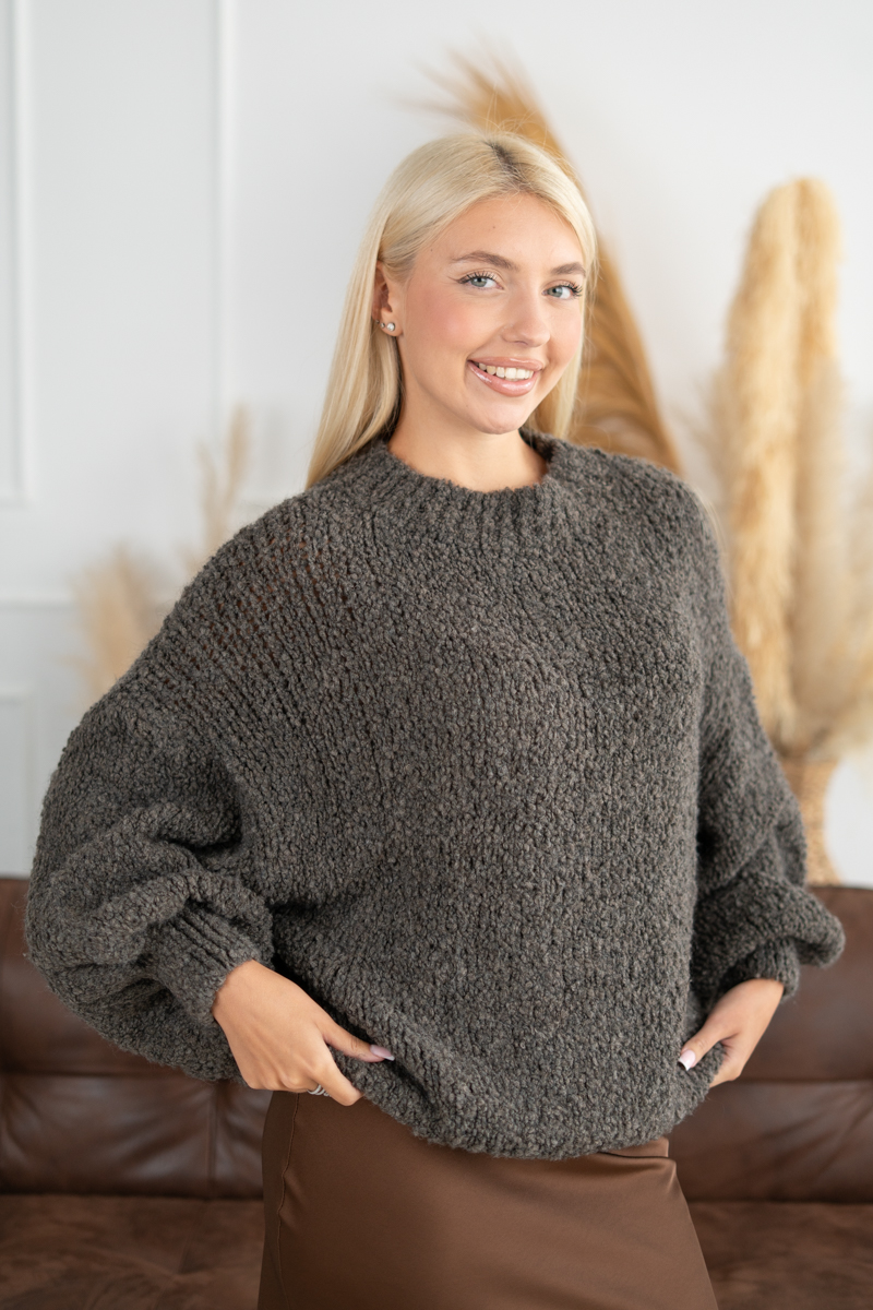 Sweter moherowy oversize Moirenne w odcieniu fango to stylowa propozycja na chłodniejsze dni, która łączy wygodę i modny wygląd. Uszyty z miękkiej, puszystej dzianiny, otula ciepłem i gwarantuje przyjemny komfort noszenia. Luźny, oversize’owy krój nadaje całości swobodnego charakteru, a jednocześnie świetnie układa się na sylwetce, podkreślając lekkość stylizacji. Klasyczny okrągły dekolt czyni go uniwersalnym elementem garderoby, który można zestawiać zarówno z jeansami, jak i bardziej eleganckimi spodniami czy spódnicą. Neutralny odcień fango doskonale wpisuje się w jesienno-zimowe trendy, dodając stylizacji ciepła i subtelnej elegancji.