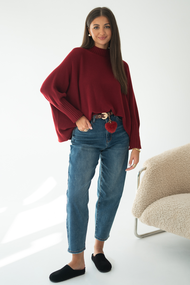 Sweter nietoperz oversize Loravie w kolorze bordowym to połączenie elegancji i wygody w nowoczesnym wydaniu. Wykonany z miękkiego, przyjemnego w dotyku materiału zapewnia komfort noszenia i swobodę ruchów. Charakterystyczny krój typu nietoperz z szerokimi rękawami oraz luźnym fasonem nadaje sylwetce lekkości, a jednocześnie prezentuje się wyjątkowo stylowo. Bordowy odcień dodaje mu wyrazistości i sprawia, że świetnie sprawdzi się zarówno w codziennych, jak i bardziej eleganckich stylizacjach. Idealny wybór dla kobiet ceniących modne detale i ponadczasowy charakter garderoby.