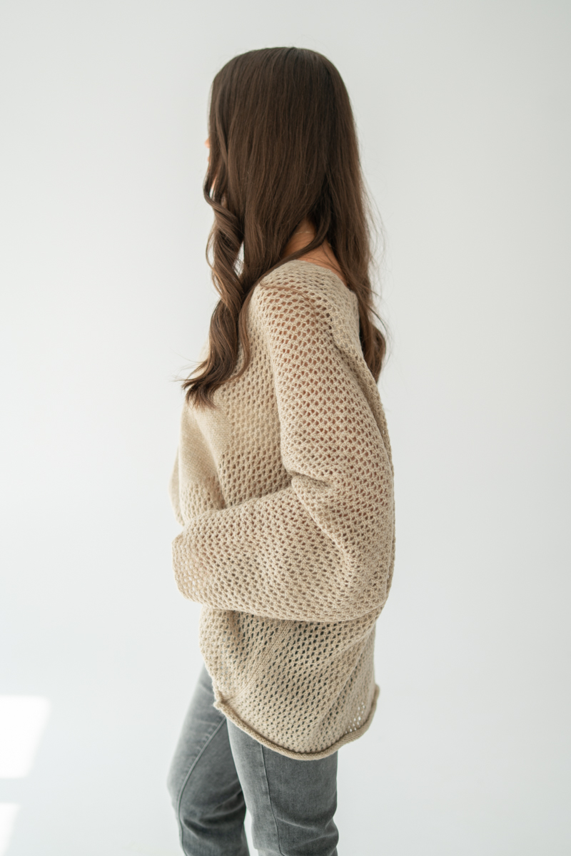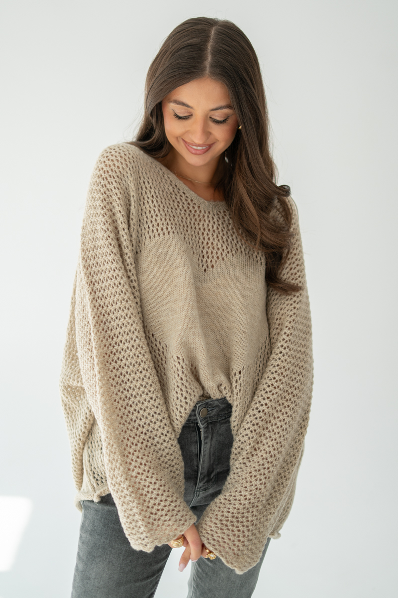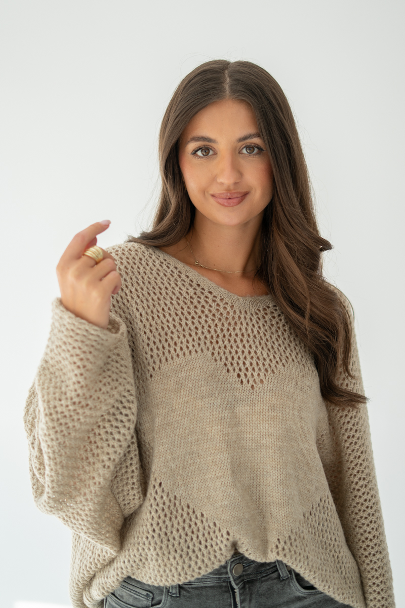 Sweter oversize Cardivra w kolorze fango to stylowa i wygodna propozycja na co dzień. Wykonany z miękkiej, przewiewnej dzianiny o ażurowym splocie, zapewnia komfort noszenia i lekkość. Luźny fason oversize gwarantuje swobodę ruchów, a subtelny wzór w kształcie serca nadaje całości wyjątkowego uroku. Neutralny odcień fango sprawia, że sweter łatwo łączyć z różnymi elementami garderoby – od jeansów po spódnice. To doskonały wybór dla kobiet, które cenią połączenie wygody, modnego designu i delikatnych detali w codziennych stylizacjach.