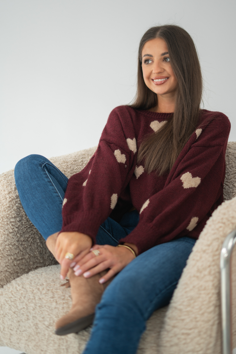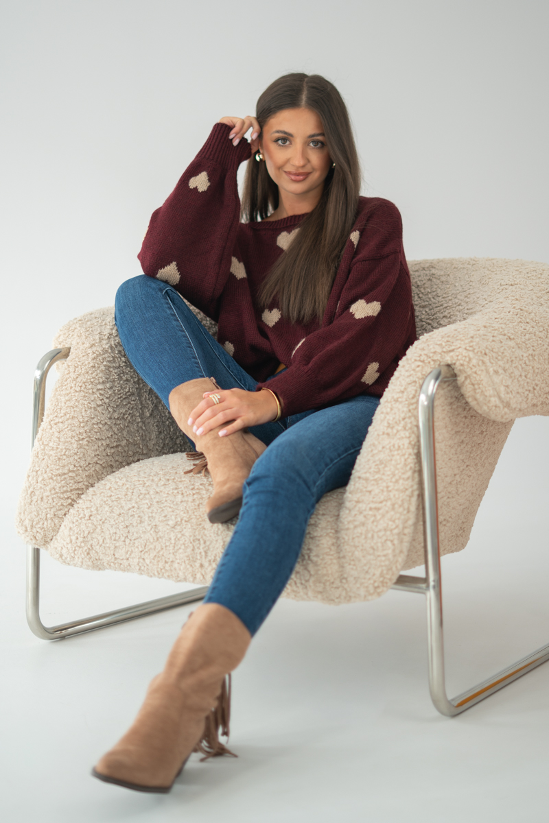 Sweter w serca Seralyn w bordowym kolorze to połączenie kobiecego uroku i wygody w codziennym wydaniu. Wykonany z miękkiego, otulającego materiału zapewnia komfort noszenia, a jego luźny, oversize’owy krój gwarantuje swobodę ruchów i modny, casualowy charakter. Beżowe serduszka na tle głębokiej czerwieni dodają mu lekkości i wyróżniają go na tle klasycznych modeli. Idealnie pasuje do jeansów, spódnic czy spodni materiałowych, tworząc stylizacje pełne ciepła i subtelnego romantyzmu. To doskonały wybór dla kobiet, które lubią łączyć prostotę z oryginalnym akcentem.