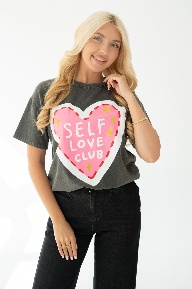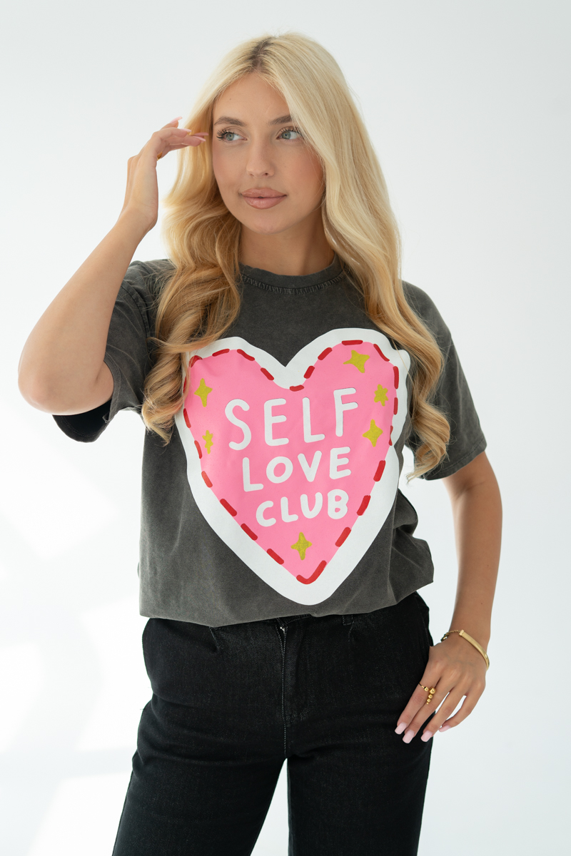 T-shirt damski z nadrukiem Self Love Club Grafitowy – Amoryne